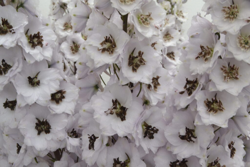 Dewi Spijker is a delphinium with long flower spikes with white, slightly purple flowers. The center of the flower is dark tinted.