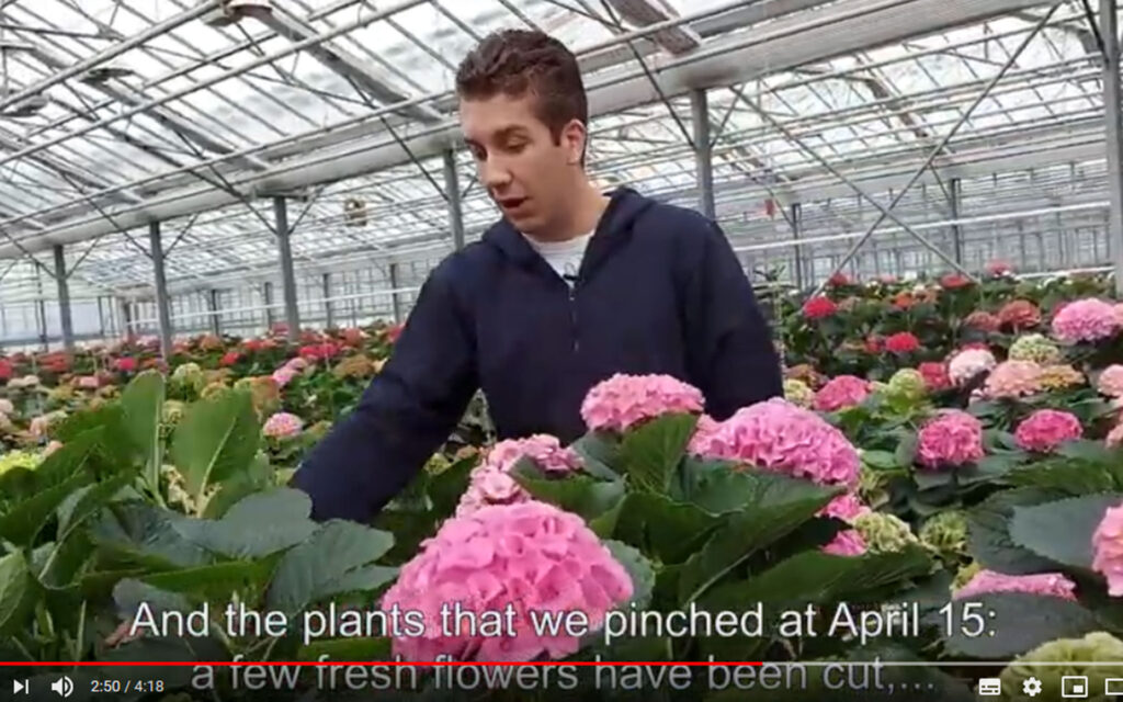 De Kwakel, November 2020 – In 2020 Hydrangea Breeders Association (HBA) did a pinching trial with cut flower hydrangeas on their test location at Agriom, De Kwakel: two plants of each variety were pinched mid March, two plants were pinched April 1st and two plants were pinched April 15th. The aim was to gain knowledge about the suitability to spread the harvest of the HBA pruning varieties. Erik van Rossum shows some of the surprising results in this video.